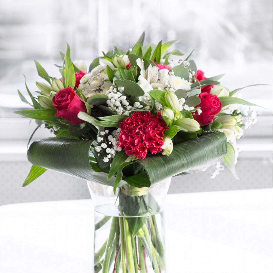Unleash pure IMAGINATION with this striking hand-tied bouquet from East Finchley Florist. Designed to inspire creativity, this premium arrangement blends luxurious red roses and rich carnations with delicate mini white chrysanthemums, cloud-like gypsophila and elegant white alstroemeria, all framed by glossy aspidistra leaves. The vibrant red and crisp white palette creates a sophisticated contrast, perfect for romantic gestures, celebrations or simply brightening someone's day. Expertly crafted by our East Finchley florists, each bouquet is delivered in bud to ensure up to 5 days of freshness, allowing you to enjoy every stage of the bloom. All available sizes are pictured for easy selection, and the vase shown is for illustration only, giving you freedom to style it your way at home. Ideal as a thoughtful gift for birthdays, anniversaries, congratulations or just because, this elegant floral gift is a beautiful way to send love and imagination across London. With next day flower delivery available on orders placed before 4 pm, you can trust East Finchley Florist for reliable, premium flowers, carefully packaged and backed by our quality guarantee. Order the IMAGINATION bouquet today and let luxury blooms tell your story.